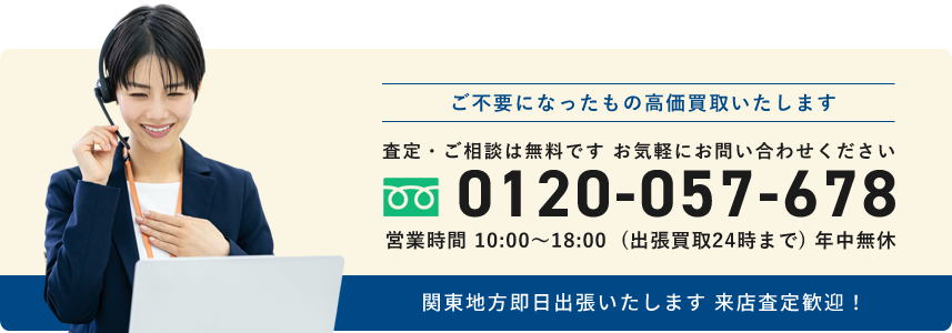 さらに、安心してご利用いただけるよう、査定料は完全無料です。どんなに小さなアイテムでも、1点から丁寧に査定いたします。「これって売れるのかな?」という疑問にも、専門スタッフが親切・丁寧にお答えします。
